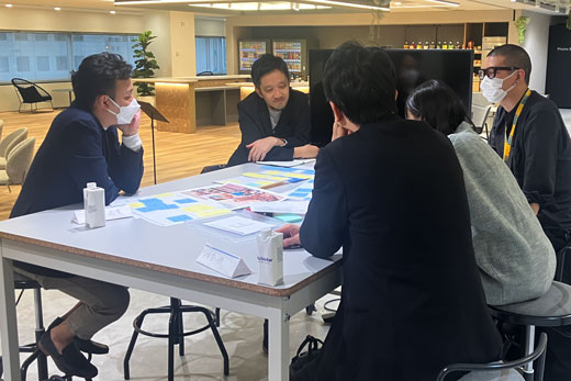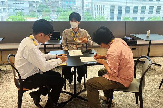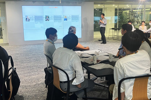 まずは、利用者やターゲットユーザーの人物像(ペルソナ)を想定し(仮説を立て)、利用者やターゲットユーザーの実際の想いを確認して検証するためのインタビュー術を会得するため、各チーム内でさらに2班に分かれ、インタビュー役、利用者役、観察役をそれぞれ1回ずつ体験します。この体験を通じて、自身が利用者になりきる感覚も養い、見直しを重ねることで人物像が明確になります。インタビュースキルを高め、利用者の言葉を傾聴できるようになることで、商品やサービスに対する本質的な要求や潜在的な課題を探りだす確率が高まっていくのです。